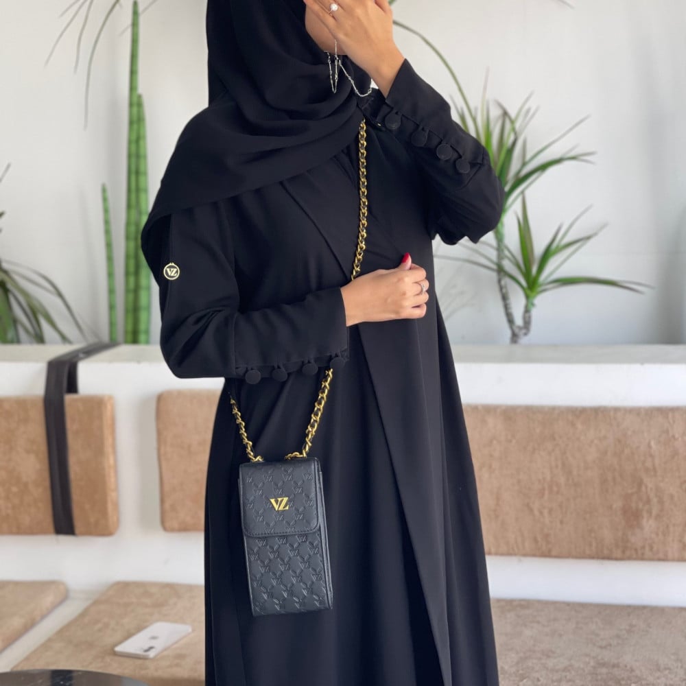 عباية باللون بالأسود مزينة بالأزارير من الأكمامبالاضافة الى جيوب مخفية .(شامل الطرحة)(تجهيز الطلب من 4-6 ايام عمل)